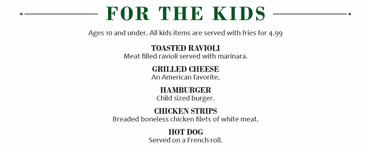 | Home | Menu | Hours & Location | Pictures | Calendar | Click Here for a PDF of the Full Menu | Appetizers | Soups & Salads | Burgers | Sandwiches | Entrees & Sides | For the Kids |
